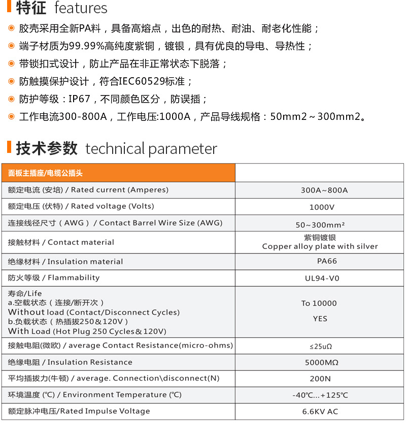 工作电流300-800A,工作电压:1000A,产品导线规格:50mm2 ~ 300mm2。